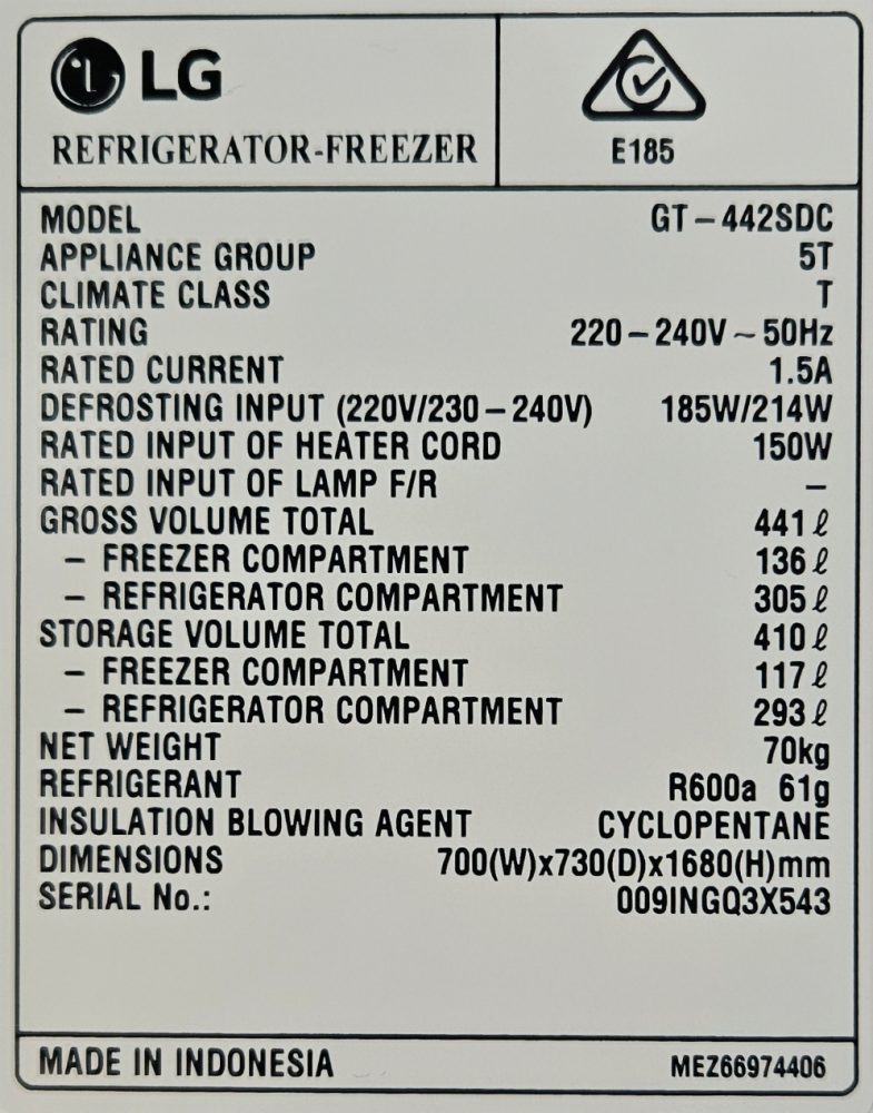 LG GT-442SDC 441L Top Mount Fridge Freezer